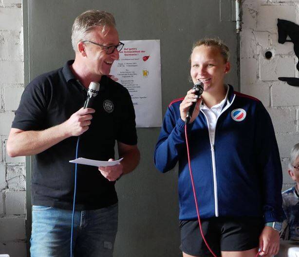 Dass das Friedrichsfelder Schlachtfest Anfang Oktober stattfindet, ist mittlerweile eine feste Tradition im Kalender des Mannheimer Vorortes. Viel mehr treibt die Besucher stets die spannende Frage um, wer denn als prominenter Gast zum Besuch vorstellig wird. In den vergangenen Jahren hatten bereits Uwe Gensheimer, Nadine Gonska, Ricarda Lobe, Gerhard Marzenell oder Elisabeth Seitz ihre Aufwartung gemacht und über Karriere und Privatleben erzählt, im Jahr 2022 war der Geschäftsführer Sport des SV Waldhof Mannheim Tim Schork zu Gast. Dieses Mal gelang es den Verantwortlichen des Veranstalters FC Germania Friedrichsfeld, mit Stine Kurz eine sehr interessante und erfolgreiche Sportlerin in die Scheuer von Christel und Walter Ries einzuladen. Stine Kurz fing ihre Karriere beim Mannheimer HC in der Jugend an. Da ihre Familie im Raum Stuttgart lebt, pendelte sie als Jugendliche mehrmals pro Woche zwischen Stuttgart und Mannheim. Bald kam die Länder-Mannschaft dazu und Stine Kurz nahm an zahlreichen U18- und U21-Europa- und Weltmeisterschaften teil. Auf internationaler Ebene sind ihre größten Erfolge ein dritter Platz bei der EM dieses Jahr in Gladbach, national feierte sie in diesem Jahr den deutschen Meistertitel mit dem Mannheimer HC nach drei vergebenen Anläufen, in denen das Team knapp gescheitert war. Richard Soppa führte durch das Interview und schon schnell entwickelte sich ein toller Schlagabtausch zwischen ihm und Stine Kurz. Dabei verriet die 23-Jährige, warum es in diesem Jahr für die Deutschen Meisterinnen keine Meisterschale gab. „Für uns wichtiger war eigentlich der Meisterwimpel. Aber abgesehen davon hätten wir auch die Schale bekommen sollen. Die ist aber beim letzten Meister verloren gegangen“, berichtet Kurz und schildert, wie die Hockey-Frauen kreativ wurden. „Wir haben dann einen Porzellanteller genommen und ihn entsprechend angemalt. Jetzt steht er in der Kabine und ist unsere Meisterschale.“ Kurz hatte einige Anekdoten parat und plauderte souverän und ohne Hand vor dem Mund von ihrem persönlichen Werdegang. „Eine wirklich sehr sympathische Person“, war nicht nur einmal das Echo der Friedrichsfelder Besucher, die sich zum Schlachtfest zahlreich eingefunden hatten. Bereits zum 16. Mal war die Traditionsveranstaltung in der Ries-Scheuer über die Bühne gegangen und einmal mehr zeigte sich Bernd Hoffmann, Vorsitzender des FC Germania hochzufrieden: „Es hat heute etwas verhalten angefangen, aber dann wurde es voller und voller. Die Friedrichsfelder lieben einfach diese Veranstaltung.“ Auch Stine Kurz war von dem gesellschaftlichen Zusammenhalt in Friedrichsfeld beeindruckt. „Ich habe mich sehr über die Einladung gefreut und habe mich wohl- und gut aufgehoben gefühlt“, erklärte die in der Neckarstadt wohnhafte Hockey-Spielerin. Am Ende des Tages vermeldeten die Essensausgabe von Wellfleisch und Bratwurst ebenso ausverkauft, wie die Kuchentheke. Im Eingangsbereich hatten Bianca und Thomas Dehoust wieder ihr üppiges Kürbissortiment in allen Farben und Formen aufgereiht. Letztlich führte ein Gewinnspiel zu einem runden Abschluss.