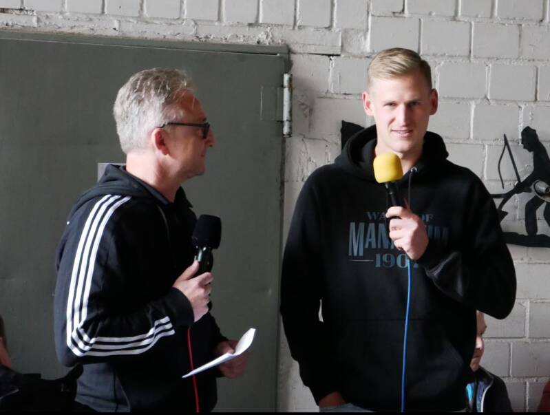 Der Name Hoffmann stand schon etwas im Vordergrund beim Schlachtfest, das der FC Germania Friedrichsfeld nun bereits zum 17.Mal in der Scheuer von Christel und Walter Ries ausrichtete. Als der Germania-Vorsitzende Bernd Hoffmann aber neben dem Ehren- und Interview-Gast Niklas Hoffmann, seines Zeichens Drittliga-Profi beim SV Waldhof Mannheim, stand, lag dann doch ein wenig Größe zwischen den beiden. Und das nicht unbedingt wegen des Promi-Faktors, denn der Präsident des Fußball-Clubs ist in Friedrichsfeld eine durchweg bekannte Person, sondern wegen den gut und gerne zehn Zentimetern Körpergröße, die zwischen den beiden lagen. „Sicherlich ist das ein Vorzug bei mir, dass ich kopfballstark bin. Aber ich versuche natürlich auch, mit dem Fuß viel Gutes anzustellen“, erklärte der 1,94 Meter große Waldhof-Profi, als er von Moderator Richard Soppa nach seinen Stärken befragt wurde. Der Waldhof-Innenverteidiger berichtete in dem kurzweiligen Interview von seiner bisherigen Karriere, die ihn auf seiner letzten Station sogar nach Österreich zum dortigen Zweitligisten SV Horn verschlagen hat, wo er sogar zum Spieler des Jahres gewählt wurde. „Ein Deutscher wird Spieler des Jahres in Österreich. Das ist schon was“, hob Soppa hervor und forderte für den sympathischen Ehrengast einen Sonderapplaus ein. Dieser hatte sich schon weit vor dem Termin für das offizielle Programm unter das Volk gemischt und Kontakt mit den Friedrichsfeldern aufgenommen. „Ich kenne das auch aus meiner Heimat. Die Scheuer erinnert mich auch an die meines Opas“, plauderte der in Landau geborene Fußball-Profi aus dem familiären Nähkästchen. In Begleitung der Social Media Mitarbeiterin vom SV Waldhof Mannheim Julia Schulz hatte er vor dem Interview bereits von den Spezialitäten des Schlachtfestes gekostet. Wie in den Vorjahren fanden das Wellfleisch und die Bratwürste mit Sauerkraut auch in diesem Jahr wieder reißenden Absatz, die Besucherzahlen dürften die Vorjahre fast noch getoppt und für eine Rekordzahl gesorgt haben. Fast alle Plätze waren belegt und manch einer war auch tatsächlich gekommen, um Niklas Hoffmann, den man eigentlich sonst nur von der Tribüne des Carl-Benz-Stadions aus beobachtet, einmal ganz nah zu sehen. „Ich habe mit Würzburg schon in Mannheim gespielt und die Fans hier sind schon etwas Besonderes“, verdeutlicht Hoffmann ein weiteres Argument, warum er den Weg zu den Blau-Schwarzen gefunden hat. Nach einer gelb-roten Karte im ersten Spiel mit anschließender Sperre sowie einer Verletzung, die er sich am vierten Spieltag zugezogen hat, liegt er derzeit auf Eis. „Ich hoffe, dass ich in zwei, drei Wochen wieder ins Mannschaftstraining einsteigen kann“, zeigte sich Hoffmann optimistisch, sich bald wieder auf dem Rasen präsentieren zu können. Soppa ließ es sich zum Abschluss nicht nehmen, den Fußballer mit einem Blick in die Historie dieser Traditonsveranstaltung zu verabschieden. „Viele unserer bisherigen Gäste haben vor oder nach unserem Interview hier richtig Karriere gemacht“, spielte er hier unter anderem auf Uwe Gensheimer, Elisabeth Seitz, Nadine Gonska oder Ricarda Lobe an. Als Niklas Hoffmann zum Abschluss gefragt wurde, wofür er sich begeistern kann, folgte eine kurze Antwort, die sogleich auch aus dem Mund von Bernd Hoffmann hätte kommen können. Sie lautete nämlich: „Fußball.“